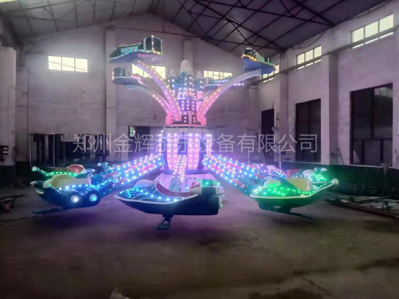 8臂自控飛機是由機械、氣動與油壓和電氣系統(tǒng)組成,運行特點:繞垂直軸中心旋轉、升降自由。河南黑獅子游樂設備生產(chǎn)的8臂自控飛機性能優(yōu)越,操作簡單。 運行時8架飛機圍繞中心火箭旋轉,并逐漸上升,游客在飛行中緊握操縱桿隨意升降,互相追逐,令人樂而忘返,新穎的造型、華麗迷人的彩燈裝飾,逼真刺激的空戰(zhàn)音響效果,它具有空云駕之驚險,自由之悠閑,是種游客可自己控制升降的現(xiàn)代游樂設施。